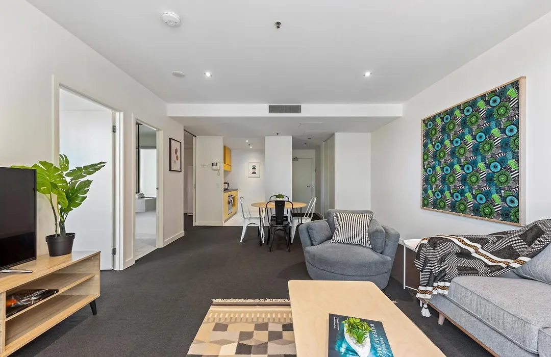 Nook Melbourne Apartments : Jane Bell Lane - Melbourne Cbd is furnished with a sofa featuring modern facilities like a multi-channel television. They are fitted with carpeted flooring. For your comfort, you will find a separate toilet, a bath, and a shower at the accommodation. Furthermore, dryers, complimentary toiletries, and towels is available.